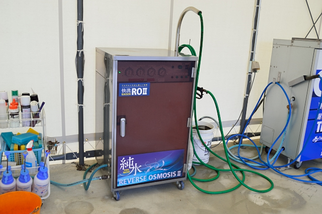 水にもこだわっており、水道水からカルキやミネラル分など不純物を取り除いた純粋な水「純水」を使用しております。純水を使う事で透明感が増し、コーティングや洗車のレベルがワンランクアップします。